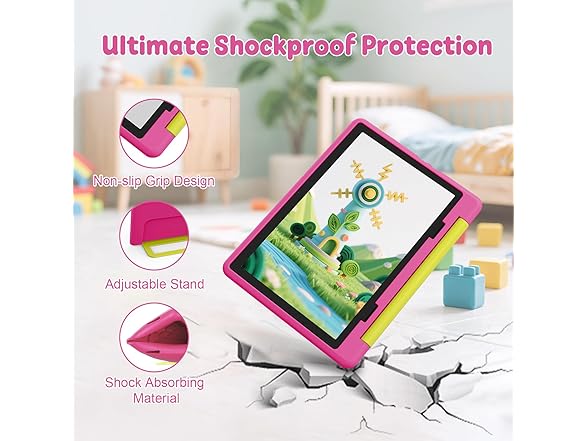 - All-Day Battery & Free Shockproof Case:From sunrise cartoons to bedtime stories, this kids tablets with long battery life(5000mAh battery)provides up to 6 hours of use for reading, watching videos, surfing the internet, and gaming. And since kids will be kids, we include a free military-grade case—making this a durable tablet with case protection against drops, spills, and chaos. No more worrying about cracked screens! Plus, USB-C fast charging (0-100% in 1.5 hours) brings your kids tablet back to life faster than a toddler’s tantrum ends.