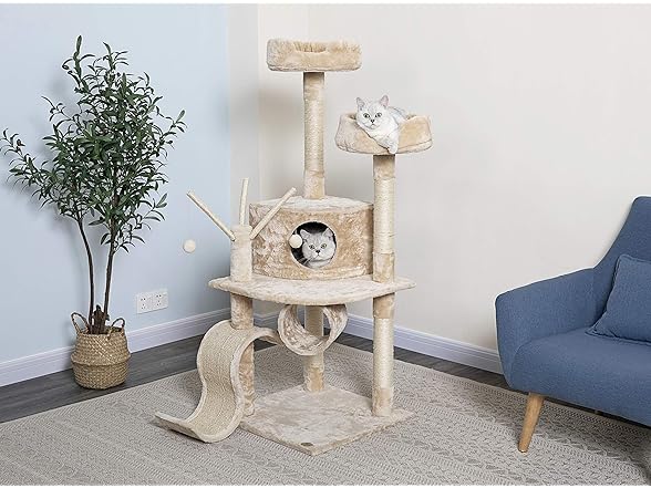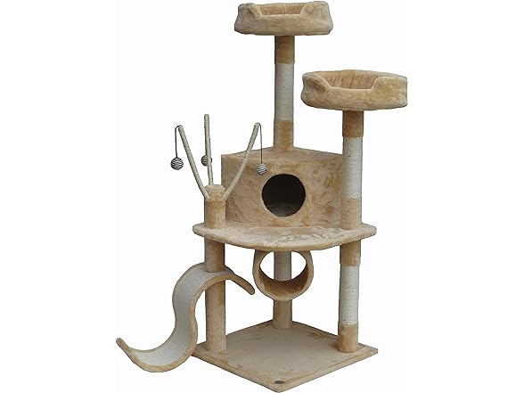 - RELAXATION AND FUN: Top perches and dual condo provide calm and fun spaces for hiding out and napping, sisal covered posts and hanging toys will keep their claws busy for batting, biting and swatting, complete with a curve slide like scratching board, this is the multipurpose all-in-one activity center for all your kitty’s needs.
