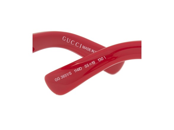 The iconic design house makes shines a bright light on re-imagining the classic cateye sunglass style. These Gucci GG 3651/S 114/ID Sunglasses are distinguished by their brick red single bridge full rim frame, which provides both structural and aesthetic support for the brown gradient lenses. The design is sufficely punctuated with the light gold toned arms, inner arm quilted diamond pattern, discrete branding on the temples andred ear tips. Measuring 57-16-130mm, this item ships with its own case, lens cleaning cloth and manufacturer's authentication tags. Measuring 55-19-130mm, this item ships with its own case, lens cleaning cloth and manufacturer's authentication tags.