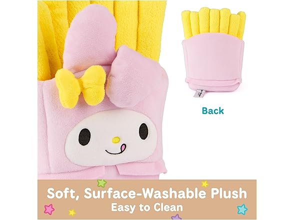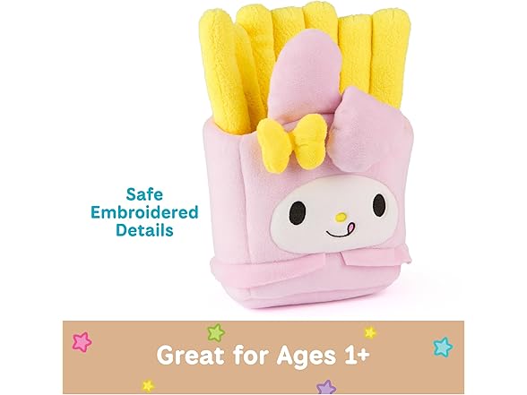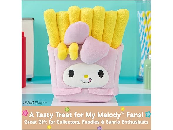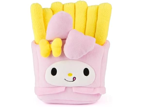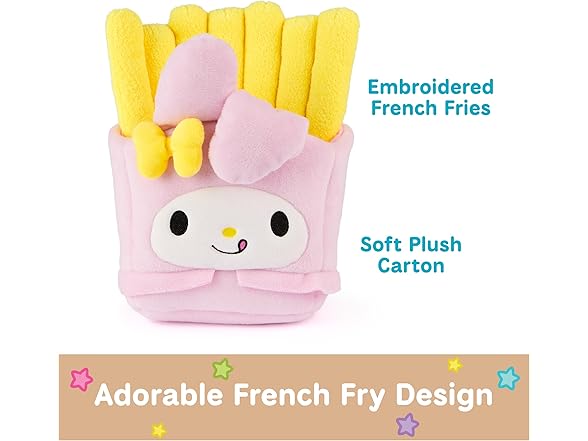 - MY MELODY FRENCH FRIES PLUSH: This soft 8” plush features My Melody as a delicious order of French fries She wears a baby-pink carton and skirt, topped by soft 6” bright yellow plush fries and a white flower detail beside her ears