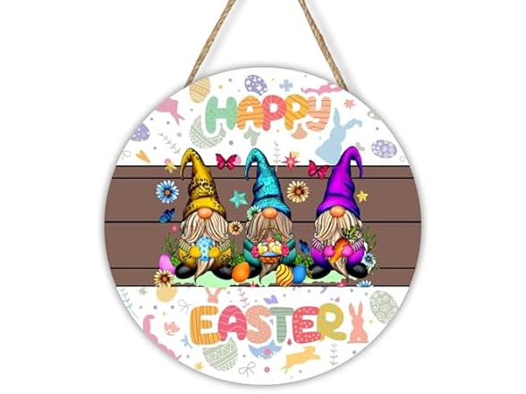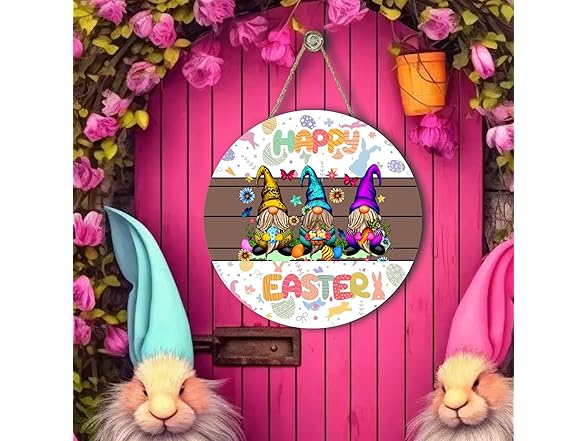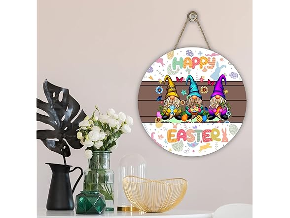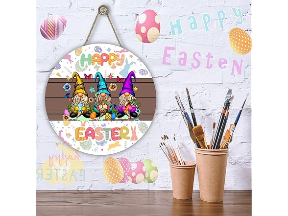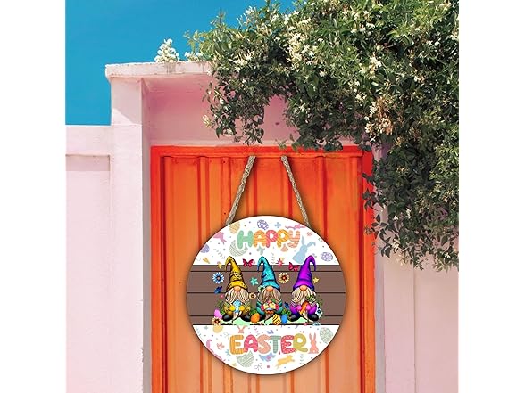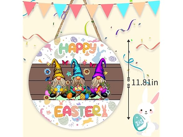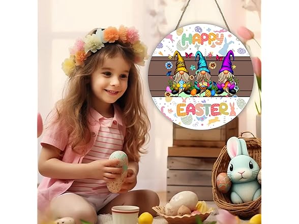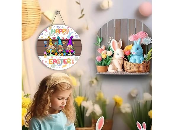 Happy Easter Door Sign Door Decorations,Easter Bunny Easter Eggs with Easter Basket Door Sign, Rustic Round Wood Easter Door Hanger Signs for Wall Door Home Indoor Outdoor Spring Decor Supplies