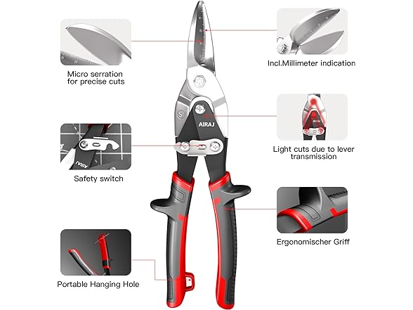 - 【Safety & Efficiency】The metal snips with safety lock, easy to open and close, can be quickly one-handed operation, self-locking nut firmly attached to avoid accidental injury, easy to store and carry; Aviation snips with composite double-lever design, cutting fast, save time and effort, help you quickly complete the work.