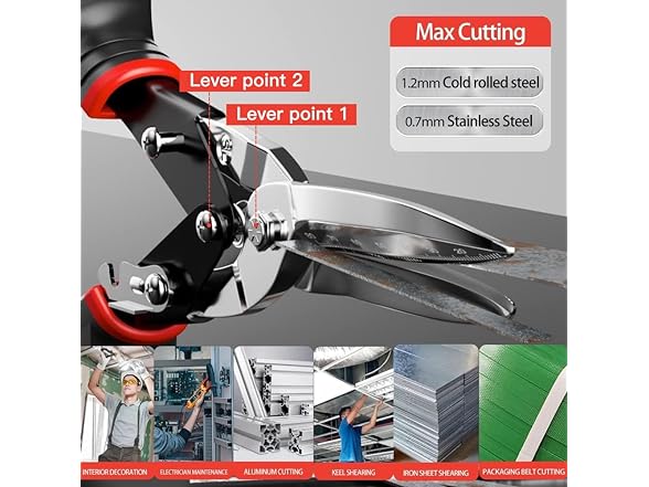 - 【Wide Cutting Range】The tin snips straight cut for cutting sheet metal have excellent cutting ability and can cut thickness range up to 18 gauge (1.2mm) cold rolled steel, 18 gauge (1.2mm) galvanized steel, 22 gauge (0.7mm) stainless steel.