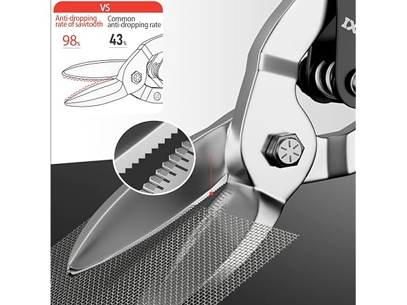 - 【Sharp & Wear Resistant】 10-inch tin snips straight cut is forged from precision-cast CR-Mo chrome vanadium steel with a hardness of HRC60 after heat treatment, high strength and toughness, improving the wear resistance and impact resistance of the tin snips heavy duty; the thickened serrated blade design spreads the cutting force to each jaw, which prevents slippage, improves cutting quality and extends tin snips life.