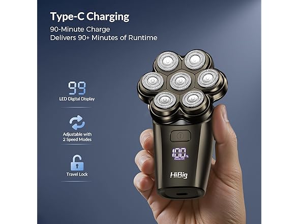 - USB-C Fast Charging & LED Display: Never run out of power mid-shave. The LED display shows real-time battery levels, while the built-in 800mAh battery with Type-C fast charging provides 120 minutes of runtime after just 90 minutes of charging. Charge anytime via laptop, car, or power bank for a convenient shave at home or on the go