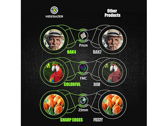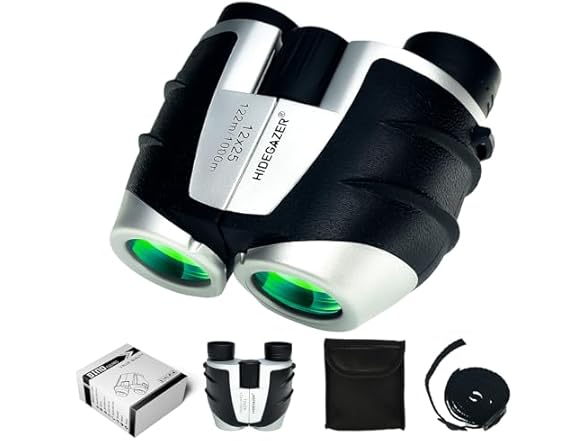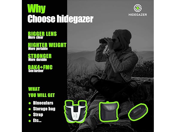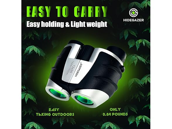 1.A durable and portable high-quality small porro binoculars 2.The package includes a pair of binoculars, neck strap, cleaning cloth, storage bag, and instructions 3.HIDEGAZER selected product, a high-quality, sturdy and portable small telescope, size: 4.5*4.25*2inch, weight: 0.64lb 4.HIDEGAZER provides high-quality customer service. If you encounter any product usage problems, please contact us in time.