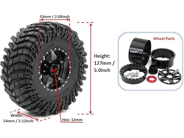 - Tires Outer Diameter: 127mm ( 5.0 inch ) / Width: 54mm ( 2.12 inch ) / Hex: 12mm