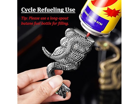 - Unique Design: This snake torch lighter features a striking three-dimensional relief pattern, combining streamlined aesthetics with durability. The zinc alloy material and polished finish create a strong texture that stands out among cool lighters.