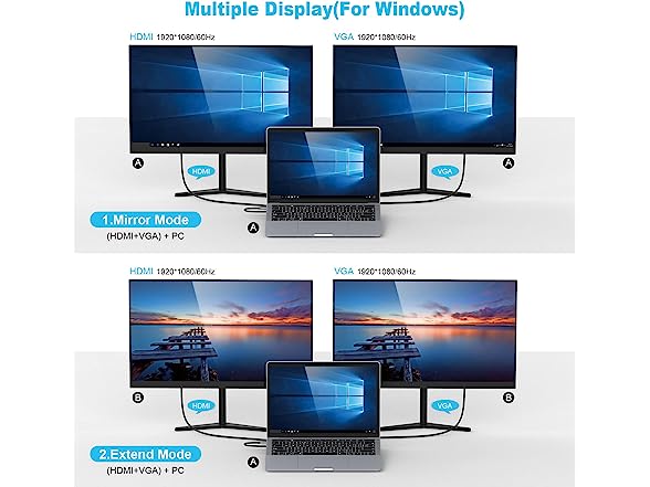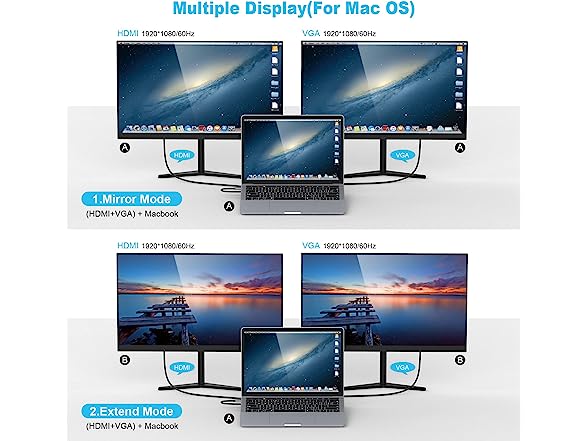 - 【Multi-display】The HDMI and VGA output can be used for your various display devices (monitor, TV, projector) simultaneously. Use our smart USB hub to expand two monitors. Work faster everywhere. HDMI the maximum output resolution reaches 4K@60Hz.