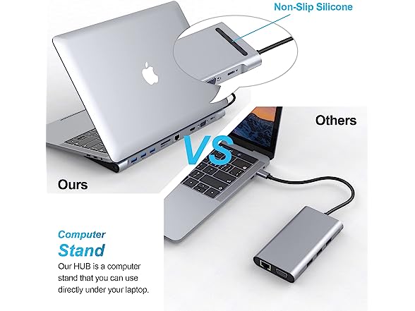 - 【Perfect for Laptop】You can put the whole HUB under your laptop, which is not only convenient to use, but also support your computer. There are non-slip silicone strips on both sides of the HUB, so your computer can be placed on this HUB stably and without damage.