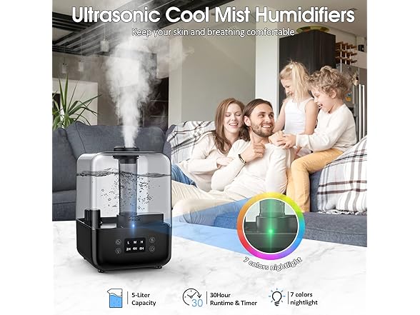 - 【7 Colors Night Light & Timer】 The humidifier is built in 7 colors light, you can set one favorite color or 7 colors changed automatically.Set a 2-4-8H timer so you won’t have to worry about accidentally leaving the humidifier on. To provide you with a quiet and comfortable sleeping environment.Warm Tip:Simply press it for 3s to turn off the nightlight.