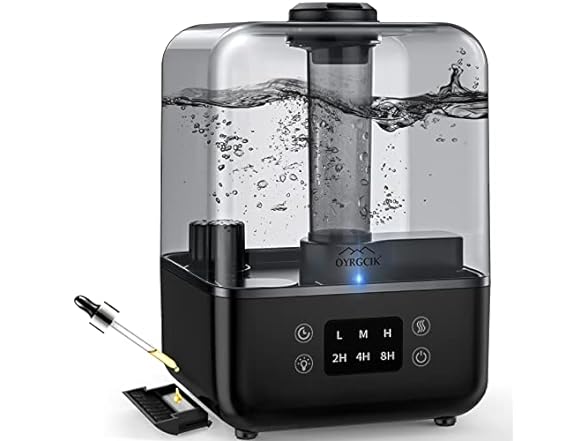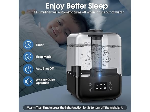 - 【Deep Sleep Mode - Whisper Quiet】OYRGCIK ultrasonic humidifier runs whisper quiet which makes it the perfect option for light sleepers, kids, and especially babies. Sensitive touch nightlight buttons help you easily change operating modes. Simply press it for 3s to turn off the nightlight. Enjoy all night mist and rest easily. Perfect for your baby and a disturbance-free sleep at night.