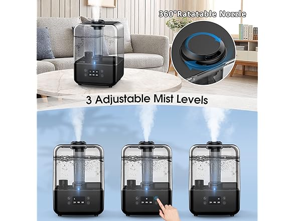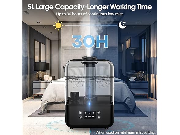 - 【Long-lasting Humidifier & Auto Shut-Off】 Large-capacity 5L water tank allows for 30 hours of continuous use; You can enjoy whole night sleep, farewell to frequent adding water. The Humidifier features an automatic shut-off safety feature that turns off the humidifier when it runs out of water preventing damage to the unit and keep you safe.