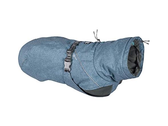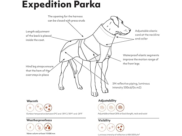 The Expedition Parka is designed to allow for extended range of motion when the dog is running and playing. The water- and windproof soft elastic segments on the front are flexible with the dog’s movements. The neckline, length of the back and the collar circumference of the Expedition Parka can be adjusted.