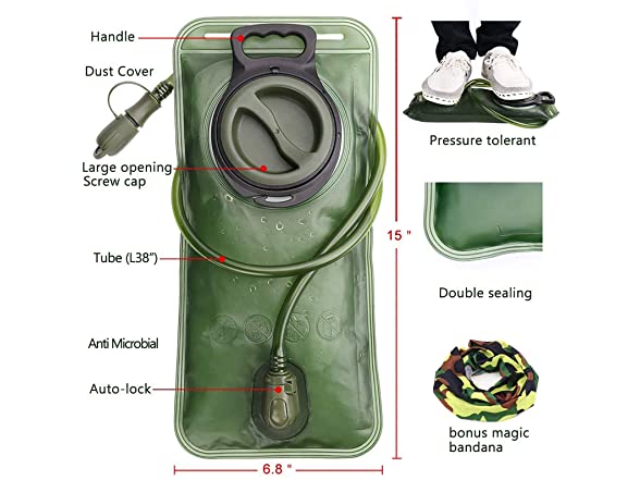 - REMAIN PEFECTLY HYDRATED – This 2L water reservoir can withstand temperatures from -20 to 50 degrees Celsius. The tube resists temperature changes in hot and cold weathers. L 14.2'' x W 6.8'' hydration bladder is compatible with most hydration packs. The tube (0.4” diameter, 40” long) provides a wholesome flow for easy drinking, keeping you hydrated when biking, cycling, hiking, or running!