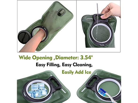 - LARGE OPENING FOR EASY CLEANING & FILLING – Our hydration bladder has one of the largest opening on the market. The big opening makes for easy pouring of water. It is also fairly wide for a hand or bottle brush easily access to the interior hydration bladder. The 4” screw on cap goes on and off easily. For cold water, simply add ice cubes directly from a scoop or refrigerator ice dispenser. The smooth inner of water reservoir promotes health and is easy to clean.
