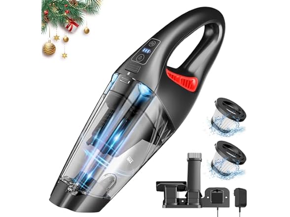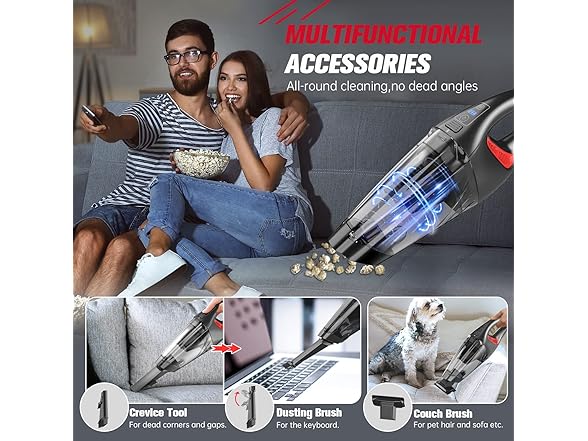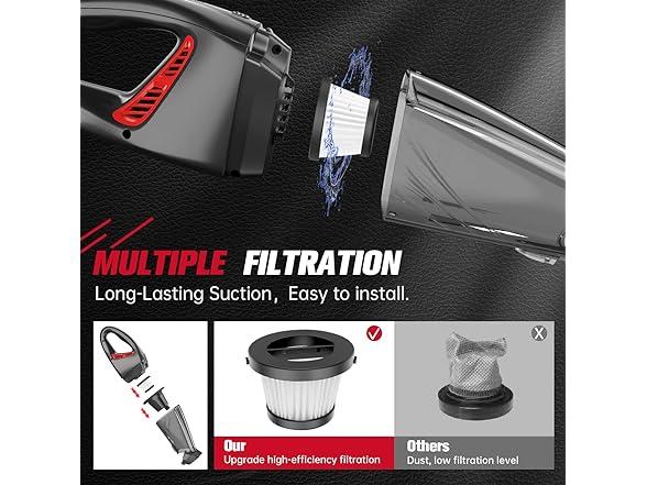 DEEP CLEANING & NO BLIND CORNERS: The handheld vacuum is equipped with 2 multi-function accessories to support all-round cleaning. 450ML large-capacity transparent dust bucket, and the "one-button dust removal" design makes emptying easy. HEPA filter can effectively filter dust and fine particles to avoid secondary pollution. Regular cleaning of the washable filter prevents loss of suction and blockage, maintains good suction.