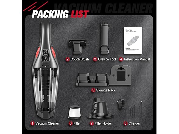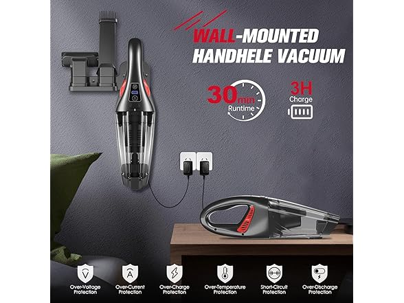 SAFE & FAST CHARGING: The handheld vacuum cordless is equipped with a 2200mAh Li-Ion battery, 30Mins Runtime, and only takes 3 hours to charge. Provide temperature/short circuit/overvoltage/overcurrent/overcharge protection to ensure the safety of the device. It can be placed on the wall with wall-mount(included) and charge at the same time, TIME-SAVING!
