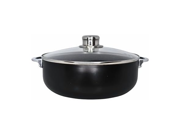 The IMUSA 4.4Qt Premier Ceramic Caldero is a versatile cooking pot crafted from lightweight yet durable aluminum. Its sleek design features a black speckled Ceramic coating on the inside and a matte black exterior body, offering an elegant yet practical look. The Ceramic non-stick coating ensures effortless food release and healthier cooking, while the easy-grip riveted handles provide a secure hold. The tight-fitting glass lid, complete with a steam vent and stainless-steel knob, seals in moisture and flavors, and the pot is oven safe when used without the lid. Perfect for cooking rice, simmering soups, beans, sauces, stews, and even baking, this caldero is ideal for everyday use, particularly for preparing traditional Hispanic recipes. Whether you're a beginner or a seasoned cook, this caldero offers the reliability and versatility every kitchen needs. Trust the IMUSA Premier Ceramic Caldero as your go-to kitchen helper. It will surely become your kitchen's beloved companion simplifying and enhancing your culinary endeavors.