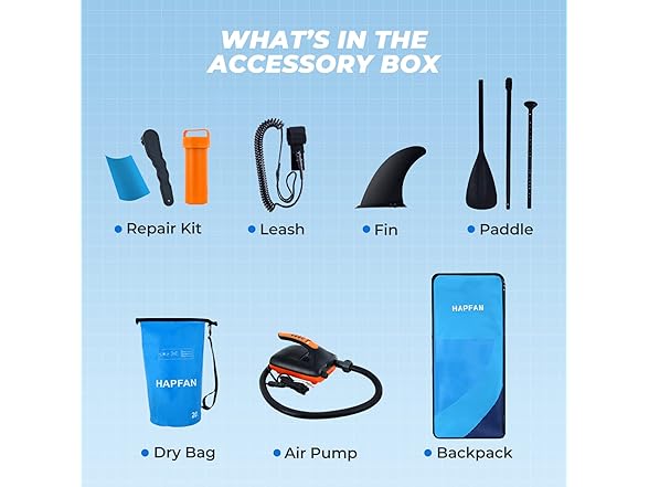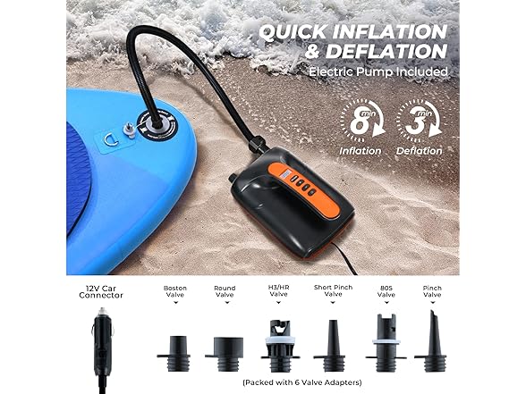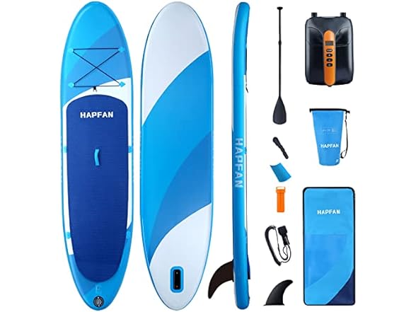 - BONUS HIGH PRESSURE ELECTRIC AIR PUMP - Hapfan stand up paddle board comes with a $99 worth dual stages inflation/deflation electric air pump connected to 12V car plug. 8-min quick inflation, blow up 2 SUPs in a row for family & friends. Do not let 20-min hand pumping kill your paddling vibe. An electric air pump is always a better company for your inflatable stand up paddle board.