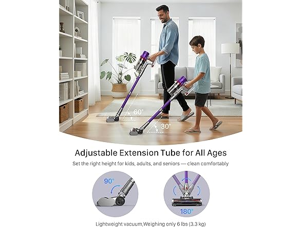 - 【Ultra-Lightweight & Maneuverable – Lighter Than a Water Bottle】Weighing only 6 lbs (3.3 kg) with a low-profile design and 180° swivel steering, it glides effortlessly under furniture and cleans stairs with ease. The adjustable telescopic tube suits all family members—adults, seniors, and teens—enabling comfortable cleaning without bending or strain.