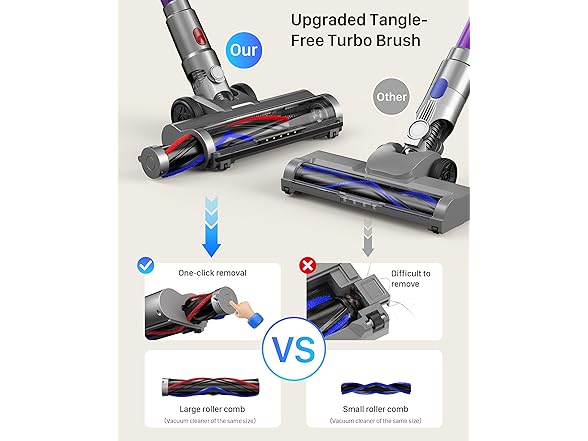 - 【Upgraded Tangle-Free Turbo Brush & LED Headlight – The Pet Hair Terminator】The Upgraded anti-tangle roller prevents hair wrap—lab-tested to handle hair from up to 6 pets with zero tangles. No more manual cleaning. Built-in LED lights reveal hidden dust under furniture, making it a must-have for pet owners and long-haired households.