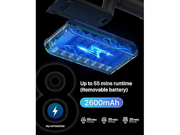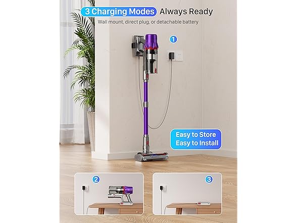 - 【Power Modes & 55-Min Runtime – Flexible for Every Task】Enjoy up to 55 minutes of fade-free suction on a single charge. Switch easily between Low, Medium, and High modes with one button—perfect for quick daily pickups or deep carpet cleaning. Recharge via wall mount, direct plug, or with the removable battery for continuous power.