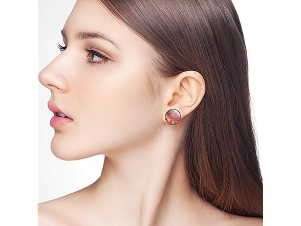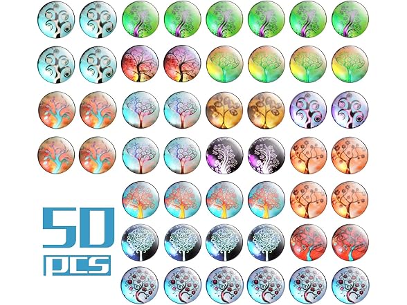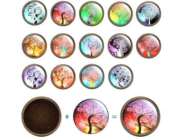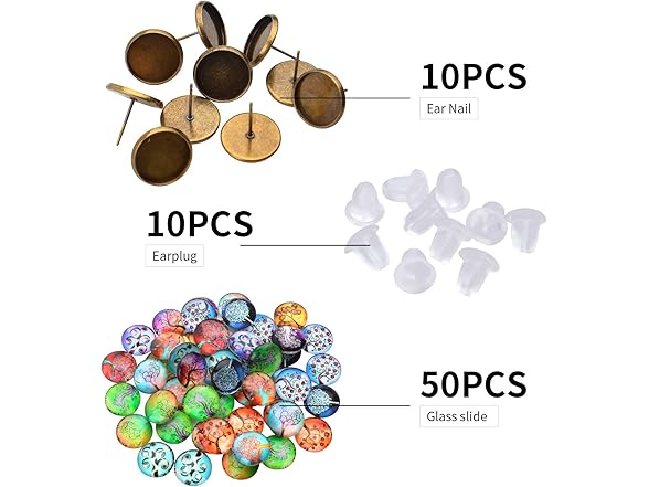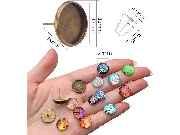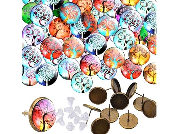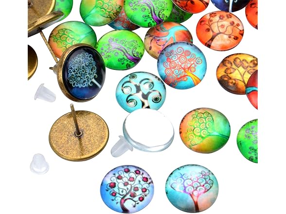 Glass Dome Cabochons, 50pcs 14 Styles Tree of Life Pattern Flatback Resin Cabochons (12mm) with 10pcs Bronze Stud Earring Bezel and 10pcs Clear Earring Backs for Jewelry Making