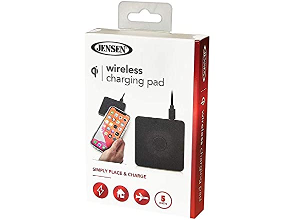 Jensen Qi Certified 5-Watt Wireless Charging Pad; Simply Place and Charge; Works with iPhone 8/X/11/12 Samsung Galaxy and Other Qi-Enabled Smartphones and Wireless Earbuds – Black