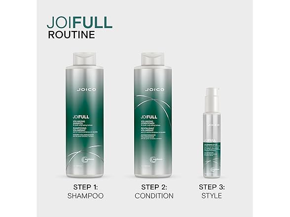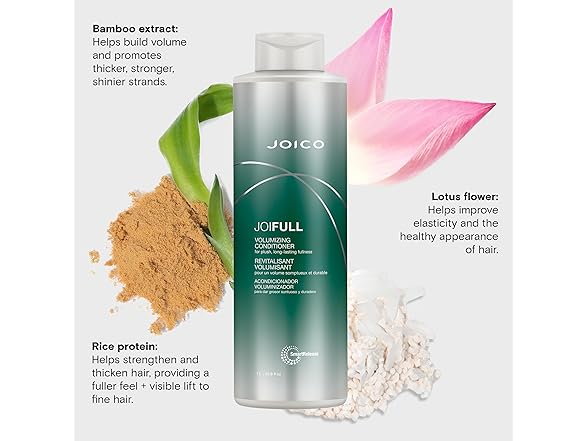 Joico JoiFULL Volumizing Conditioner with Bamboo Extract, Rice Protein and Lotus Flower help this lightweight conditioner instantly detangle while adding airy body and fullness to hair.