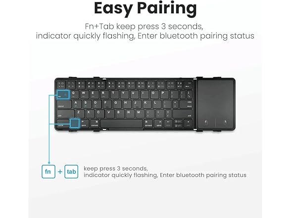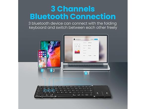 The keyboard has three Bluetooth channels: This folding keyboard has three Bluetooth channels, you can connect three Bluetooth devices separately, and then choose different Bluetooth channels to control different devices, if you have multi-device working habits, this can meet your needs well (when Bluetooth connection, after selecting the Bluetooth channel, you need to long press fn tab to connect a new device