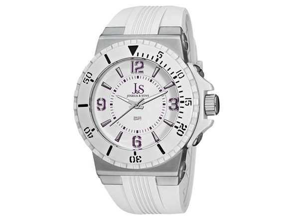 The purple numerals contrast with the white dial of this rugged men's watch from Joshua & Sons. A white rubber strap and luminescent hands finish the masculine style of this timepiece.