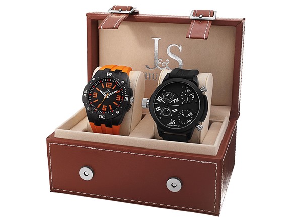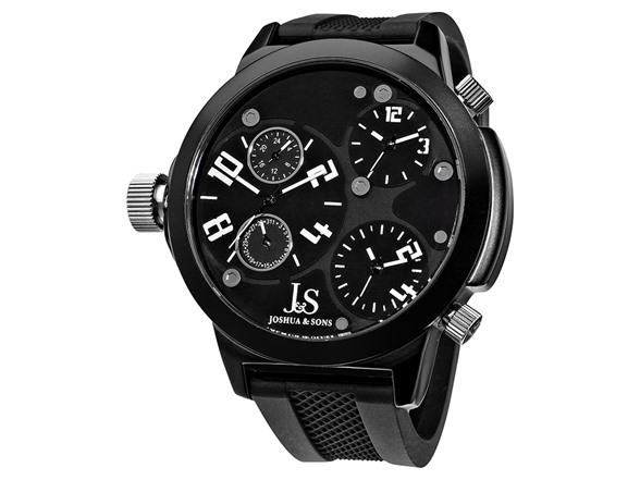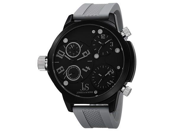This attractive and fashionable Joshua & Sons timepiece is made of top quality materials and superior workmanship. The black step dial has a triple time zone display with the main dial featuring the date and GMT. The Silicon rubber strap finishes the masculine style of this watch.
