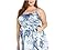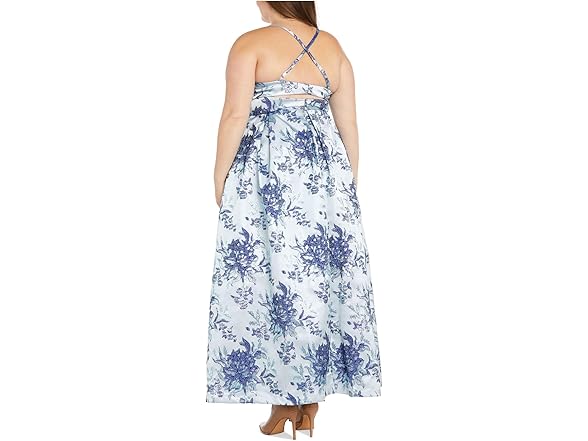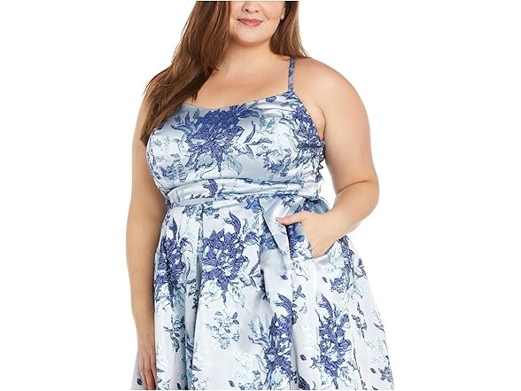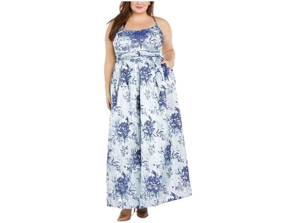 Juniors Long Floral Brocade Ball Gown W/Spaghetti Straps & Cut Out Back Blue