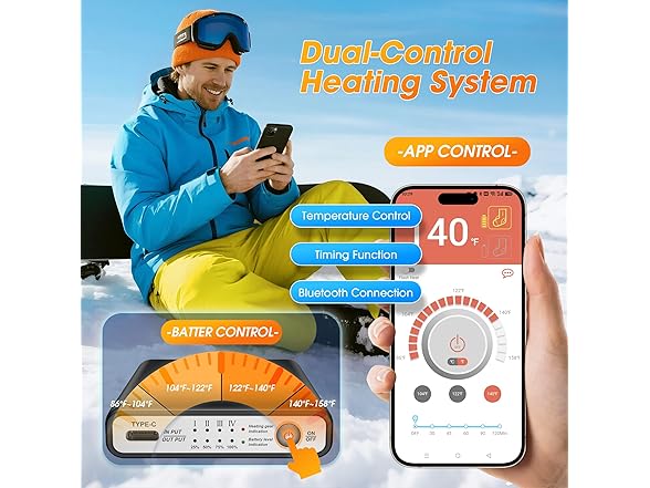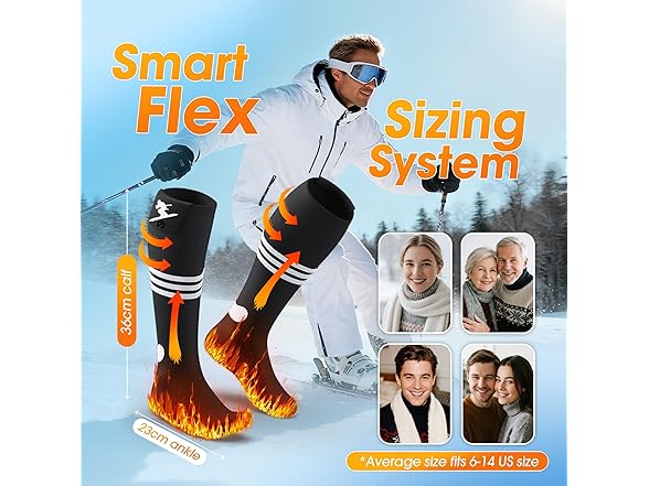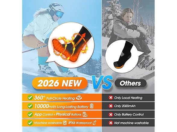 - 【2026 Newest-Generation Smart APP Control】Added real-time power display and estimated battery life features,clearly understand the working status of the heated socks for men,helping you plan your outdoor trips with ease. The temperature of the heated socks women can be adjusted to any value between 86 ℉ and 158 ℉ through the APP.Besides, the heated socks for women can also turn off automatically with a timer.