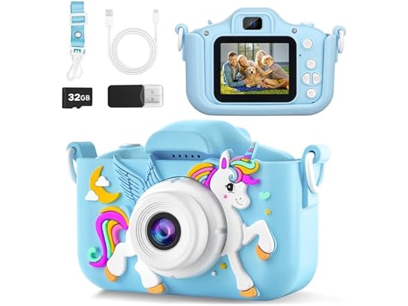 - 【Multi-Scene】-The kid camera is perfect for outdoor play&birthday party, and comes with a strap for easy carrying, a 32GB memory card, a card reader, a charging cable, and a gift box. Start capturing memories today with this all-inclusive camera set!