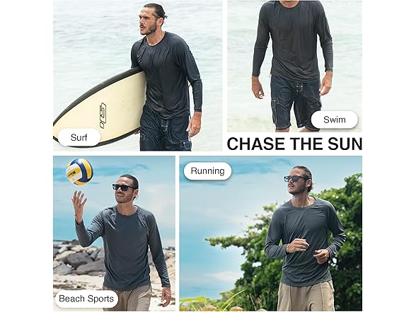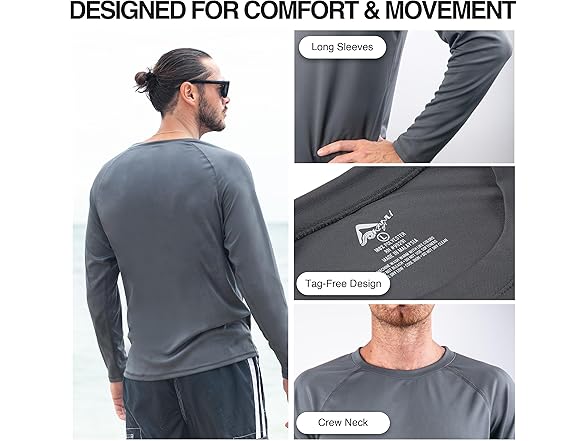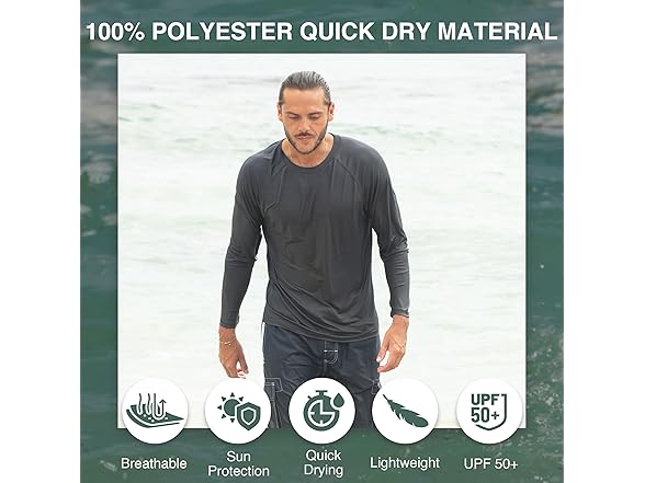 • Versatile and Multi-Use: Perfect for a variety of activities, this rash guard for men's long sleeve water shirt will also be your go-to fishing shirt, running shirt, and mens hiking shirt