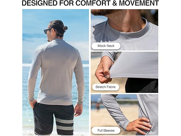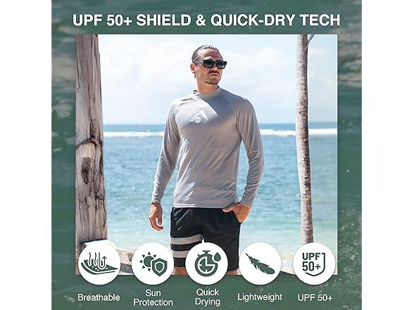 - UPF 50 Sun Protection: Our long sleeve mens swim shirt provides superior UPF 50 sun protection, ensuring you stay shielded from harmful UV rays at the beach. Ideal sun shirts for men, they are a must-have for surfers and water sports enthusiasts.