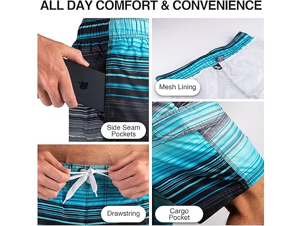 - Quick Drying Fabric: Our swimming trunks for men feature lightweight and durable microfiber fabric that dries quickly, ensuring all-day comfort whether you're swimming or lounging.