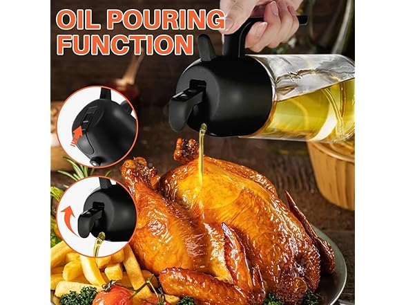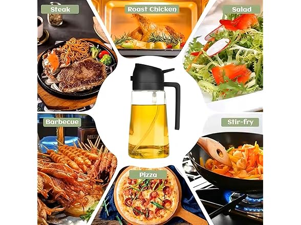 - 2-in-1 Design: Combines an oil dispenser and sprayer in one sleek bottle, perfect for precise oil pouring or fine mist spraying for various cooking needs. And suitable for food preparation processes such as salad dressing, griddle, roasting, grilling