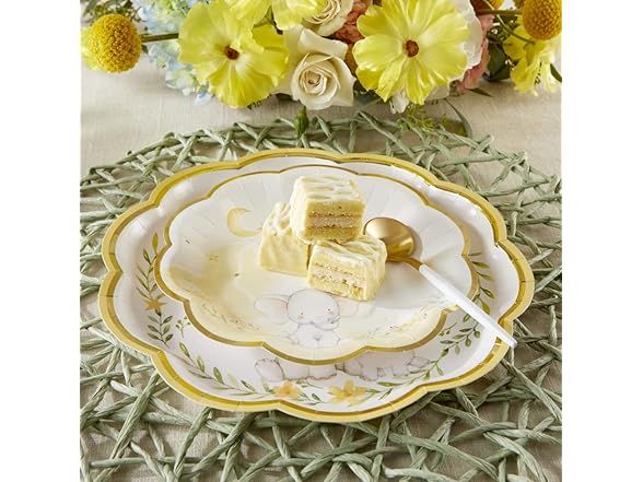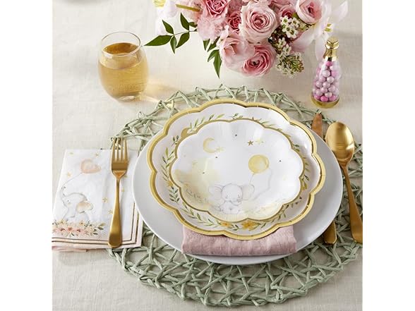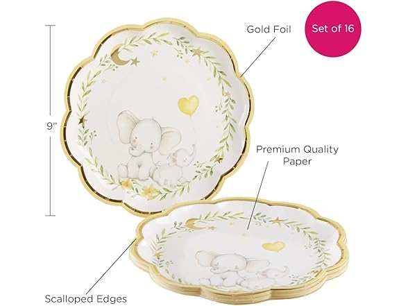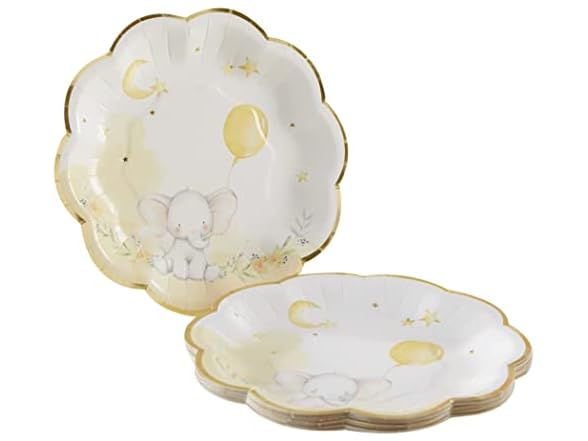 - BEAUTIFUL & FUNCTIONAL The elephant baby shower 7in plate features a cute baby elephant in the center holding a yellow balloon with a yellow moon and scattered gold foil stars and a gold foil scalloped border. Showcase your elephant baby shower with decorative paper plates from Kate Aspen. This whimsical design is perfect for guests to grab a snack and features a sophisticated gold foil border as well as a loveable jungle elephant design.