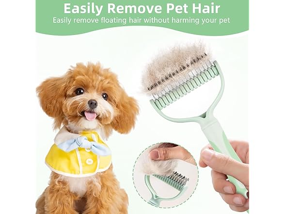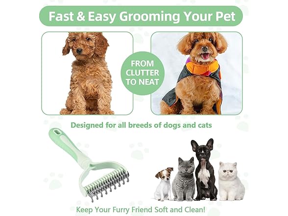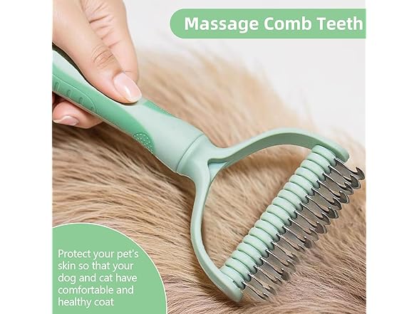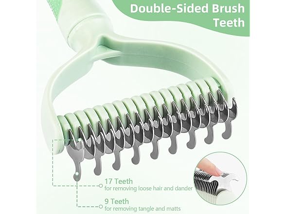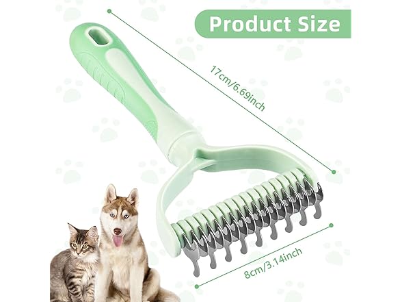 - 【2-in-1 Dual-Sided Pet Comb】:Meet your new go-to grooming hero! This 2-sided dematting tool means business—9 tough teeth tackle gnarly mats and stubborn tangles like a pro, while 17 finer teeth gently sweep away loose fur and smooth out knots. Whether you’ve got a tiny terrier, a medium mutt, a large pup, or a finicky feline, this comb’s got their coat covered.