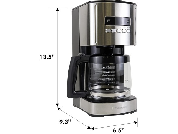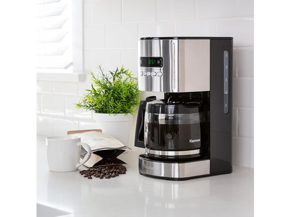 In the Box: (1) Kenmore Aroma Control Programmable 12-cup Coffee Maker, Stainless Steel/Black with Glass Carafe, LCD Display, Reusable Cone Filter, and Charcoal Water Filter