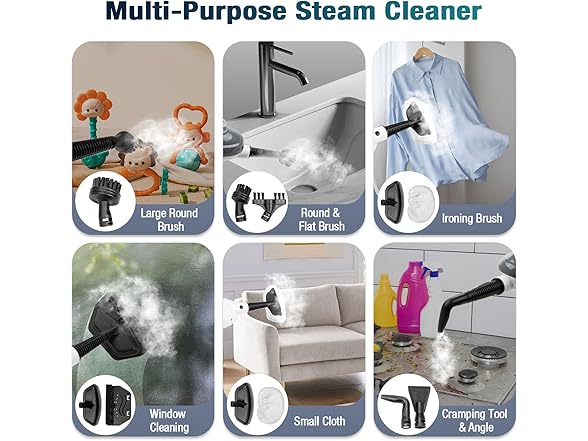 - 【All-in-One Handheld Steam Mop】 This multi-purpose handheld steam cleaner comes with 11 accessories to tackle cleaning tasks all over your home. Perfect for floors, clothing, glass, furniture, stoves, sinks, carpets, and more. The included tools, such as an angle nozzle, brass brush, and window cleaning tool, make it easy to clean hard-to-reach areas and everyday messes with ease.