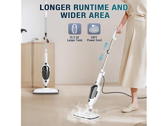 - 【23-ft Ultra-Long & Easy-Storage Cord】 This floor steam cleaner features a 23-ft ultra-long power cord, allowing you to clean your entire house without constantly switching outlets. The hook design makes cord storage quick and easy. With its self-standing feature and durable, sleek design, this steam mop is both convenient and easy to use, anytime and anywhere.
