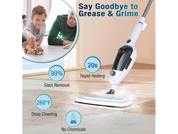 - 【260°F High-Temperature Deep Cleaning】 Our steam mops for floor cleaning heats up to 260°F, producing powerful, consistent steam that removes 99.9% of stubborn stains without harming floors or furniture. No need to buy expensive detergents—just water for a safe, chemical-free, and eco-friendly clean, perfect for homes with kids and pets.