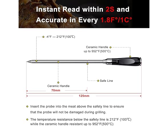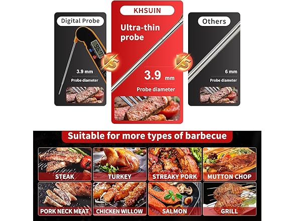 - 🎁【Probe is So Impressive as its Wide Application】Design for various thickness of meat. The only one that covers a full range of small meat barbecues such as pork neck, chicken tenders, pork breast, salmon, etc. Little 3.9mm probe insert meat with less effort. KHSUIN Wireless Meat Probe also nice for use in cramped spaces. So, in an oven it can be on top of a roast and still not be in the way. It's also convenient to use in an air fryer or small frying pan because it won't stick out as far.