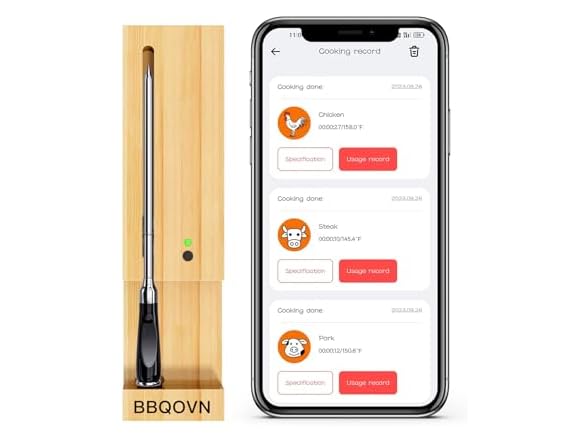 - 🎁【If You’re Lookin’ You Ain’t Cookin】Go ahead and multitask. Wireless connection up to 700 FT, wandering far from kitchen or grill while still monitoring the steaks and chops. Monitor cooking progress easily with the free APP. Set up custom alerts and notifications based on temperature or time. A wireless meat thermometer will not only help to get the precise temperature but also cook meat evenly and thoroughly without drying it out.