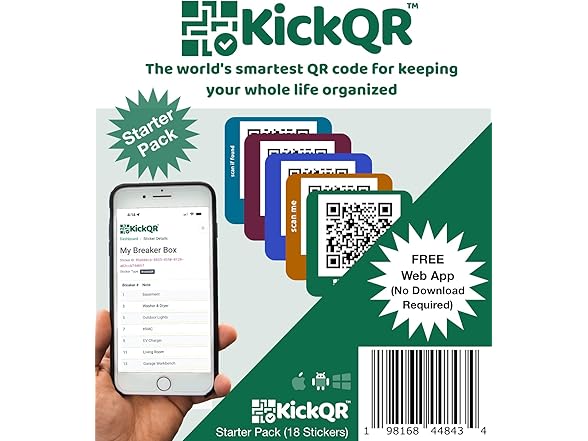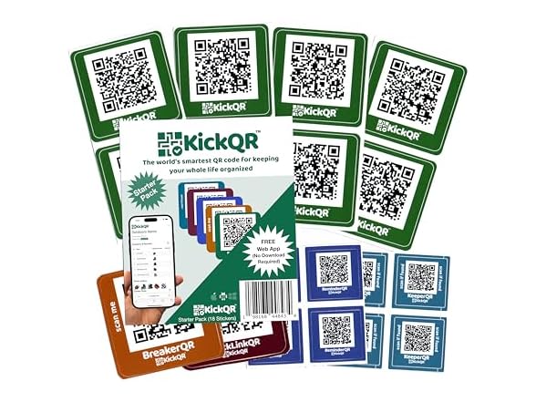 Get started with KickQR home organization smart QR code stickers with this Starter Pack. The Starter Pack includes 8 of our most versitile OrganizeQR stickers for organizing boxes and bins, 4 of our KeeperQR stickers for Lost & Found, 4 of our ReminderQR stickers for organizing reminders of things like water and air filters, 1 BreakerQR sticker to organize your electrical panel, and 1 QuickLinkQR sticker, which can easily be used to forward to a web address, like an even RSVP or anything else. The KickQR smart QR code system works with a single account, and you can alway buy more stickers of any variety in order to keep building out your home organization system. There is no subscription to buy and no app to download, so you don't have to worry about being locked in.
