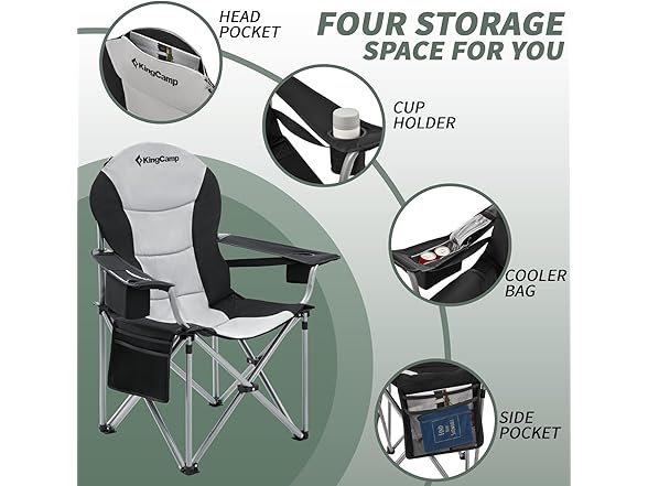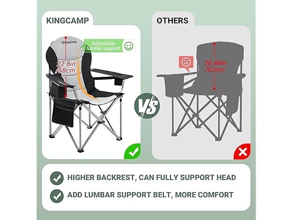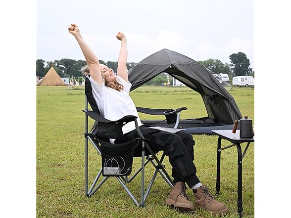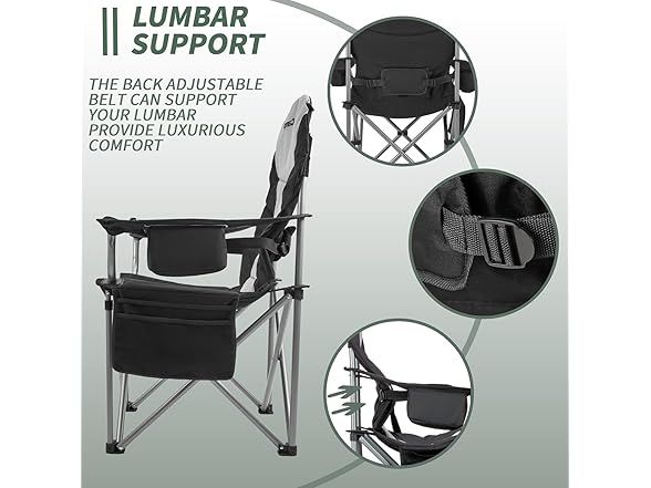Tired of sore backs during outdoor hangs? Our adjustable lumbar support oversized camping chair is the ultimate upgrade you've been longing for! Picture this: you're lazing in the sun at the beach, casting a line by the lake, or having a great time at a picnic. With fully padded backrests and armrests, it's as if you're wrapped in a warm embrace, chasing away fatigue even during long stretches of sitting. And when it comes to storage? There's a cup holder for that ice-cold soda, side pockets for your favorite snacks, a cooler bag to keep treats fresh, and a headrest pocket for your phone – all your essentials are within easy reach. When it's time to hit the road, it folds up in a jiffy, making it super portable for every one of your adventures. The heavy duty steel frame and 600D Oxford fabric ensure it stands the test of time, offering you dependable comfort on every trip. Don't pass up this chance to transform your outdoor experience!
